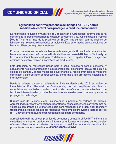 The National Plant Protection Organization (NPPO) of Ecuador (AGROCALIDAD) has confirmed the presence of Fusarium oxysporum f. sp. cubense Tropical Race 4 (Foc TR4) in a banana production area in El Oro Province, Ecuador, following laboratory confirmation. The detection was reported through official public communications from AGROCALIDAD on December 18, 2025.