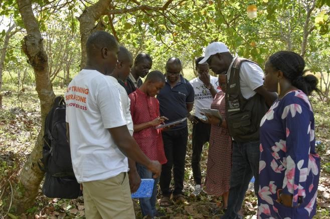 On a scorching afternoon, in Sumbuya village, Kakua chiefdom, Bo District, three farm workers—Mamie Squire, Mohamed Yambasu and Morie Lavai stand in a sprawling 1000-acre cashew farm as 40 phytosanitary specialists, crop and crop protection officers from Sierra Leone’s Ministry of Agriculture and Food Security, Njala University and Sierra Leone Agricultural Research Institute demonstrate the use of digital and geospatial surveillance of pests such as a the Stem girdler, Diastocera trifasciata- a threat to economically important crops such as cashew.